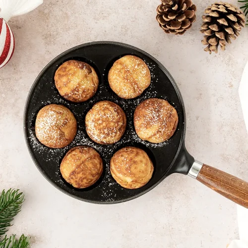 - Fyld hullerne trekvart op med dej. Vend æbleskiverne med et træspyd, en kvart omgang, når de begynder at stivne og hæve i kanterne. Fyld efter med en smule mere dej i midten af æbleskiven og vend den derefter helt rundt. På denne måde får man de fineste runde og fyldige æbleskiver. Vend æbleskiverne nogle gange i løbet af stegning, så de bliver stegt på alle sider og bliver gennembagt.